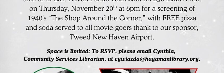 Join us at East Haven Public Television on 230 Main Street for a screening of the Christmas classic The Shop Around the Corner (1940), starring Margaret Sullavan and James Stewart. Set in Budapest before Christmas, the film follows Alfred Kralik and Klara Novak as they unknowingly fall in love through letters. Doors open and pizza and drinks will be served […]