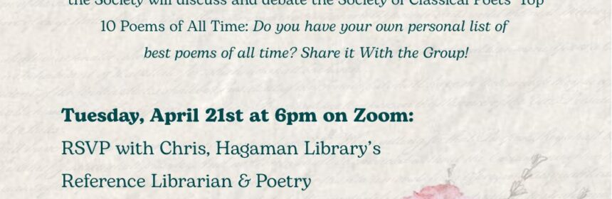 On Tuesday, April 21st at 6pm on Zoom, Hagaman Library’s Poetry Appreciation Society will meet to discuss and debate the Society of Classical Poets “Top 10 Greatest Poems Ever Written” in honor of National Poetry Month. To receive the Zoom link, please contact our Reference Librarian, Chris Hemingway at: chemingway@hagamanlibrary.org.