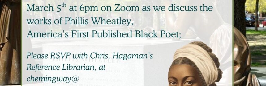 Join us for our next meeting of the Poetry Appreciation Society on Thursday, March 5th at 6pm on Zoom as we discuss the works of Phillis Wheatley, America’s First Published Black Poet; Please RSVP with Chris, Hagaman’s Reference Librarian, at: chemingway@hagamanlibrary.org.