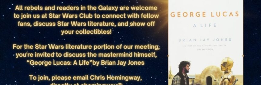 A group for Star Wars fans! January Book: George Lucas: A Life by Brian Jones. For a Zoom code, please contact: chemingeway@hagamanlibrary.org