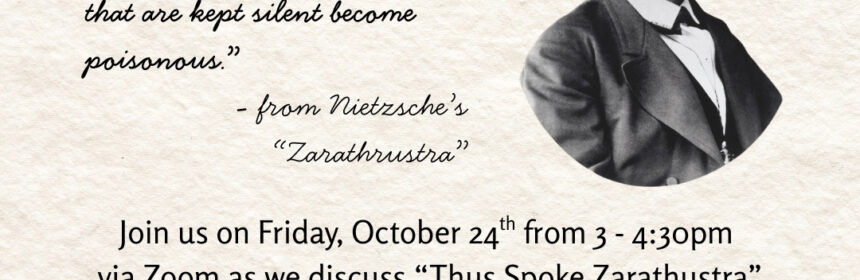Philosophy Club: “Thus Spoke Zarathustra” by Frederic Nietzsche-Friday, October 24 at 3:00 p.m. (Zoom)